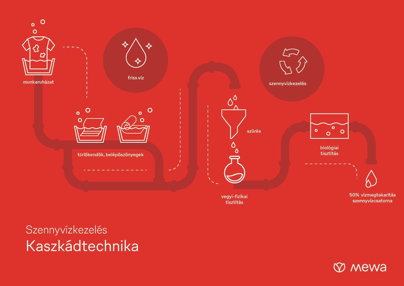 Ma, ötven évvel később, még mindig sikeresen alkalmazzák ezt a kaszkád technológiának nevezett hatékony eljárást, amelynek segítségével az öblítővizet újra fel lehet használni. A technológia lényege, hogy az utolsó öblítési ciklusok vizét megszűrik, és ismételten felhasználják a jobbára erősen szennyezett ipari törlőkendők és szőnyegek mosásának első fázisaiban. A Mewa ezzel a módszerrel akár ötven százalékkal is csökkenti a mosás során felhasznált friss víz mennyiségét.